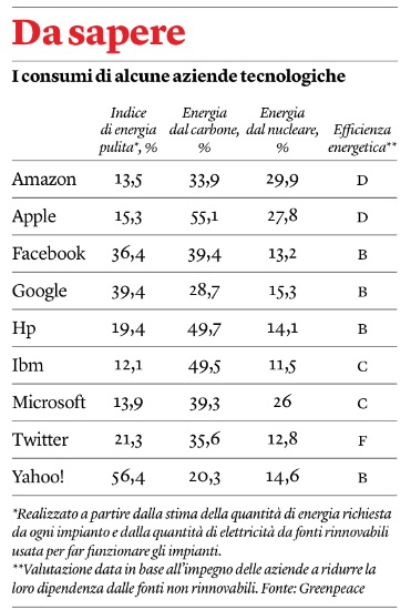 Pare che i data center nel mondo consumino più di 30GW (~30 centrali nucleari, quanto tutta l’Italia), corredati da gruppi di continuità a petrolio e/o miglia di batterie a piombo-acido. In media usano solo tra il 6 e il 12 % della potenza per attività di calcolo, il resto viene usato per tenerli pronti all’uso in caso di pichi di richiesta.